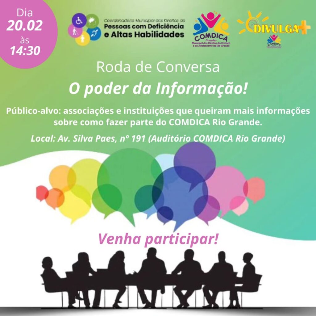 O Conselho Municipal dos Direitos da Criança e do Adolescente – COMDICA Rio Grande, em parceria com a Coordenadoria Municipal dos Direitos das Pessoas com Deficiência e Pessoas com Altas Habilidades – CODIPD Rio Grande, convida aos interessados a participar da roda de conversa “O PODER DA INFORMAÇÃO”. Serão abordados os temas: – Conhecendo melhor […]