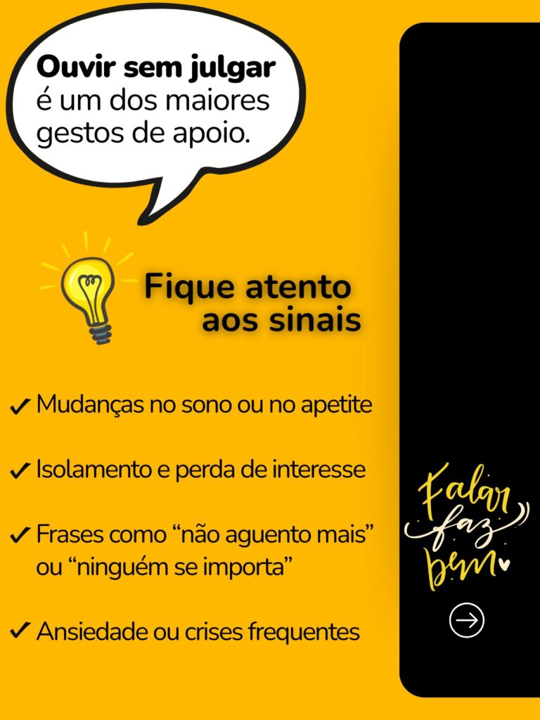 PraTodosVer : cards na tonalidade amarelo e preto, com as escritas: (1) Setembro Amarelo: você não está sozinho! Sua vida importa!; (2) Saúde Mental para Jovens e Crianças, falar é o primeiro passo para cuidar de si. Fale! (3) Ouvir sem julgar é um dos maiores gestos de apoio. Fique atento aos sinais: – mudanças no sono ou no apetite; – isolamento e perda de interesse; – frases como ‘não aguento mais’ ou ‘ninguém se importa’; – ansiedade ou crises frequentes; – Falar faz bem. (4) Conta comigo! Rede Pode Falar. Um espaço seguro, gratuito e anônimo para: – aprender sobre ansiedade, autoestima e estresse; – fazer testes interativos (como o de ansiedade); – acessar vídeos, podcasts e cartilhas; – encontrar orientações para jovens e para quem cuida. Acesse www.podefalar.org.br ; (5) Você não está sozinho. Lembre-se: você não está sozinho. Se precisar de apoio imediato, ligue CVV 188 (24h e gratuito). Finalizando com a logomarca do projeto Divulga + e do COMDICA. Fim.